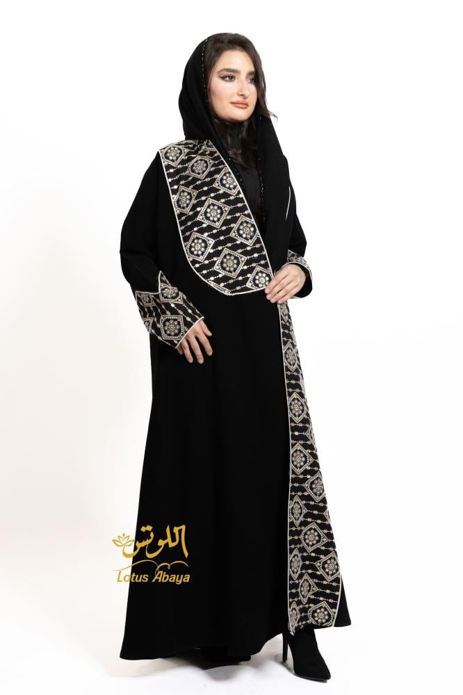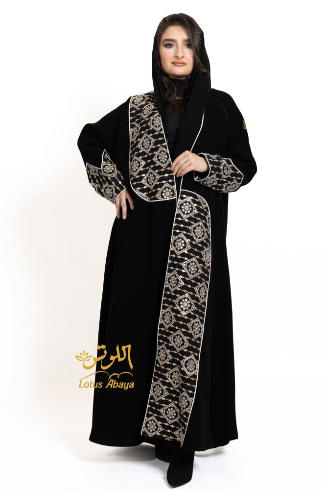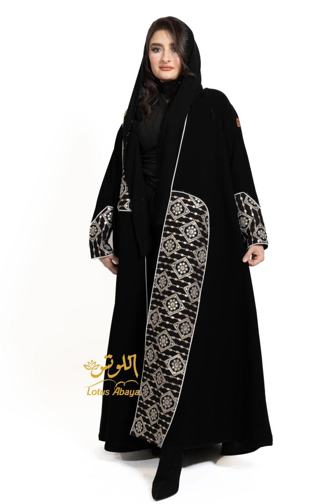 عباية "عهود" بتصميم راقٍ من قماش السيراميك الطايح، مزينة بتدخيلات فاخرة من الشغل الذهبي على الأمام والأكمام، لتمنحك إطلالة كلوحة فنية أنيقة. مثالية للتميز بأسلوب فريد وجذاب