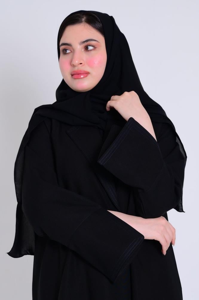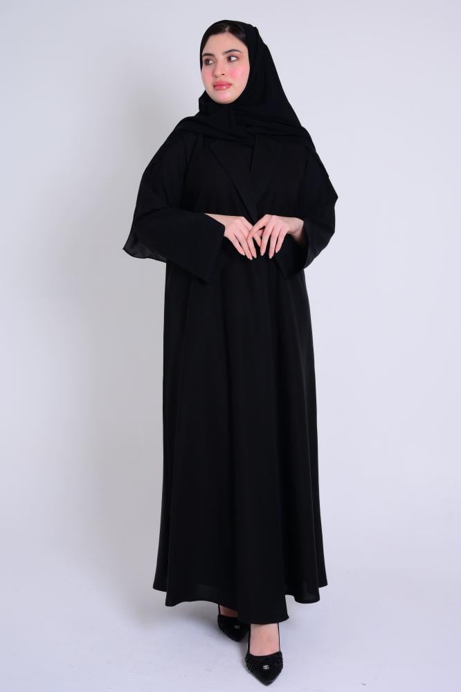 - القصّة: تصميم بلايزر أنيق بلمسة عباية، يشمل ياقة رسمية (لابل)، أزرار أمامية، وخطوط خياطة دقيقة. تتميز بـ قصة كلوش تبدأ ضيقة من الأعلى وتتسع تدريجيًا للأسفل، ما يمنحها أناقة وانسيابية في الحركة مع الحفاظ على طابع رسمي.