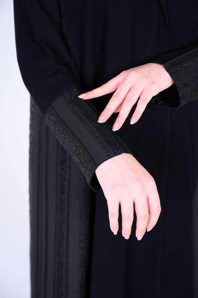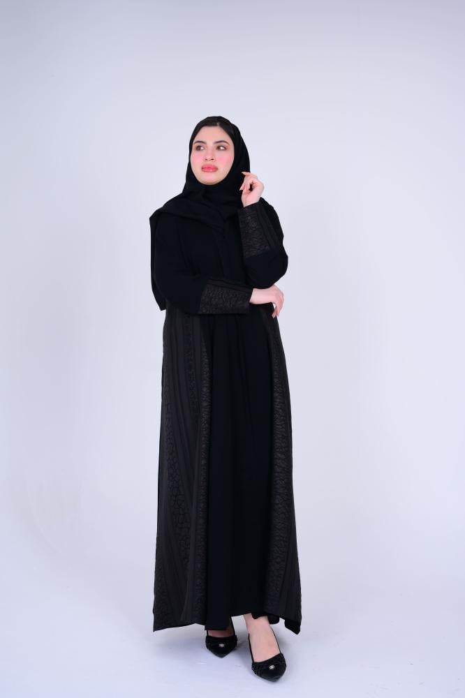 عباية راقية بخامة سواد ملكي فخم، مع شغل مشجّر أنيق من الجوانب يضيف لمسة أنثوية جذابة.