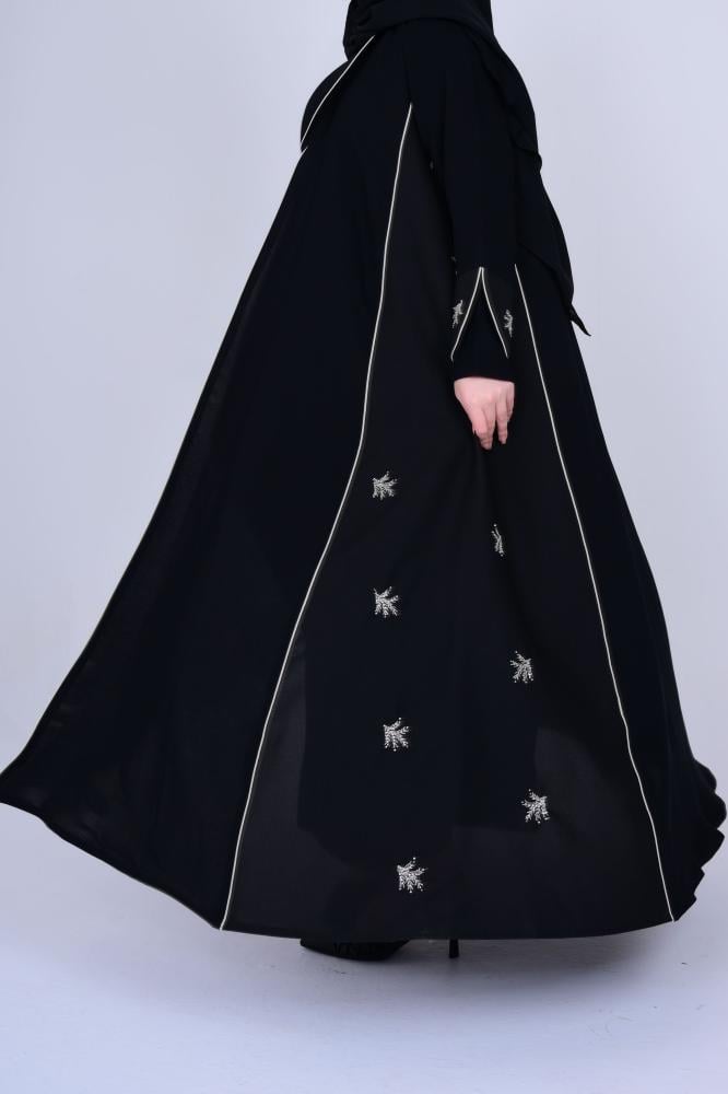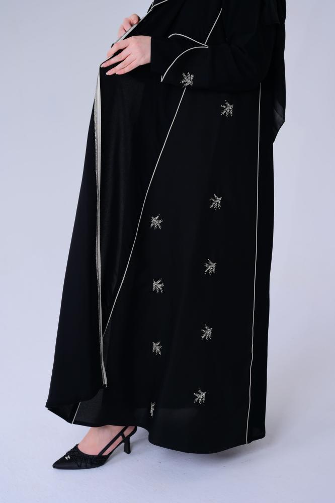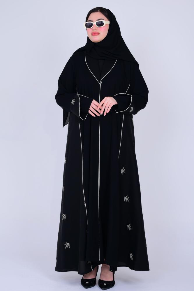 عباية مميزة بخامة سواد ملكي فاخر، مع تدخيلات كتان أنيقة من الجوانب وتطريز ناعم فوقه شك لامع يضيف لمعة جذابة.