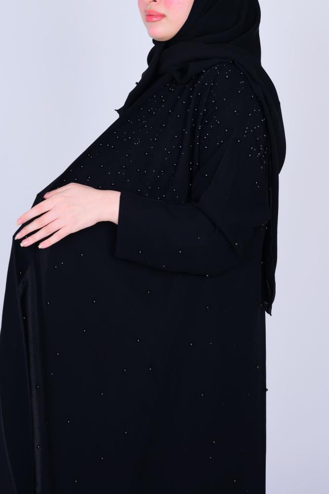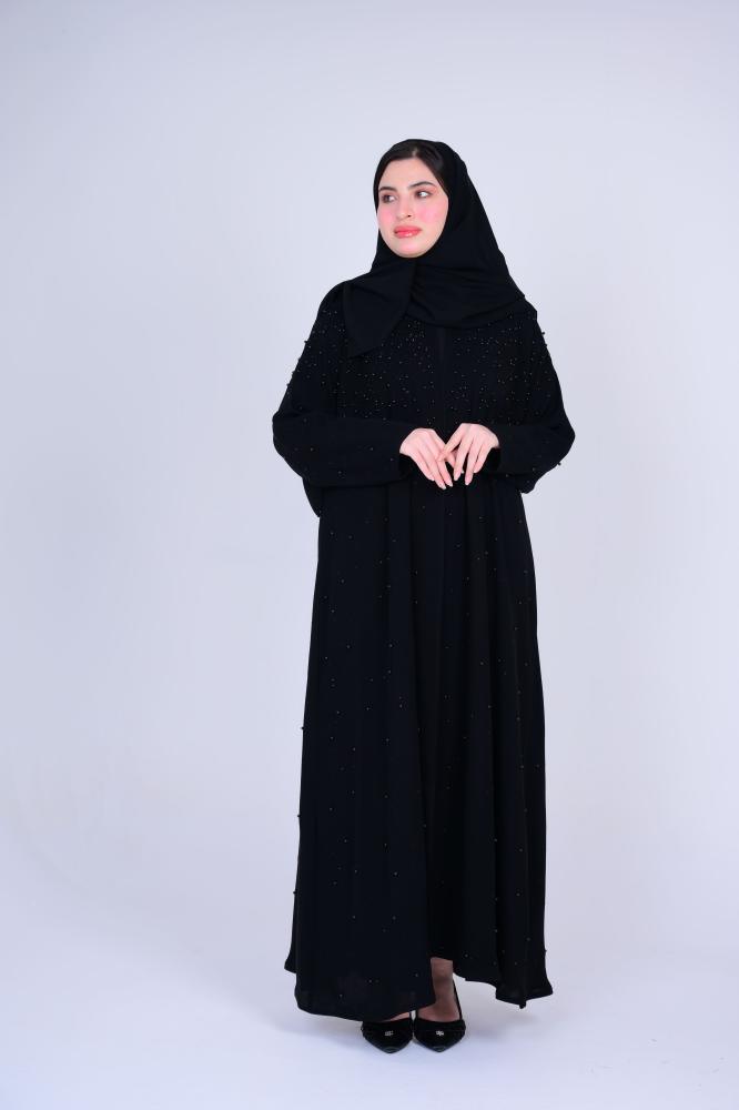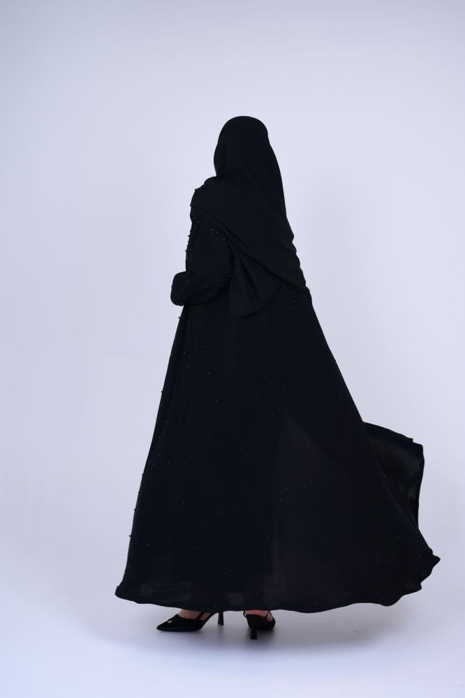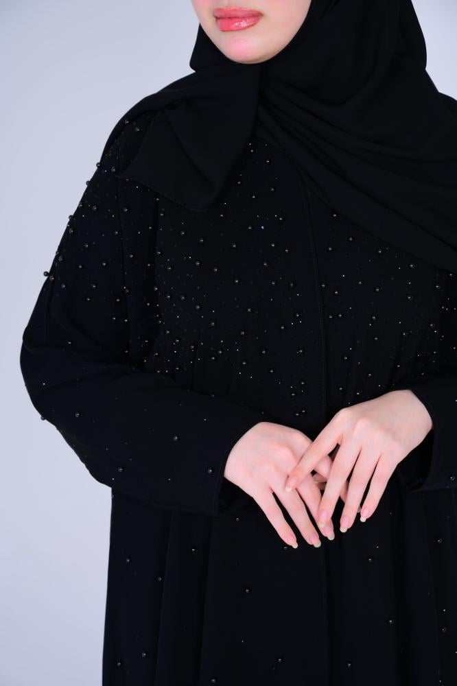 تصميم خرز اللؤلؤ المنتشر بانسيابية على العباية، كأنه نجوم من نور متناثرة على سحاب الليل 🌌